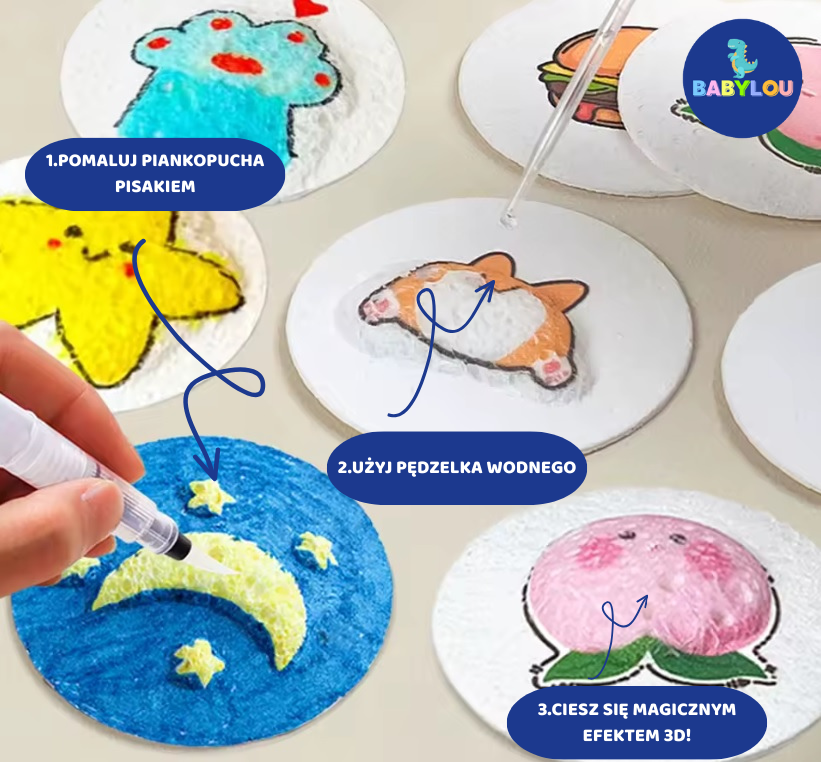 Odkryj zupełnie nowy sposób kreatywnej zabawy! Piankopuchy to wyjątkowe płatki artystyczne, które po muśnięciu mokrym pędzelkiem przemieniają się w miękką, kolorową piankę 3D. To nie tylko malowanie – to sensoryczna przygoda, która pobudza wyobraźnię i rozwija zdolności manualne.