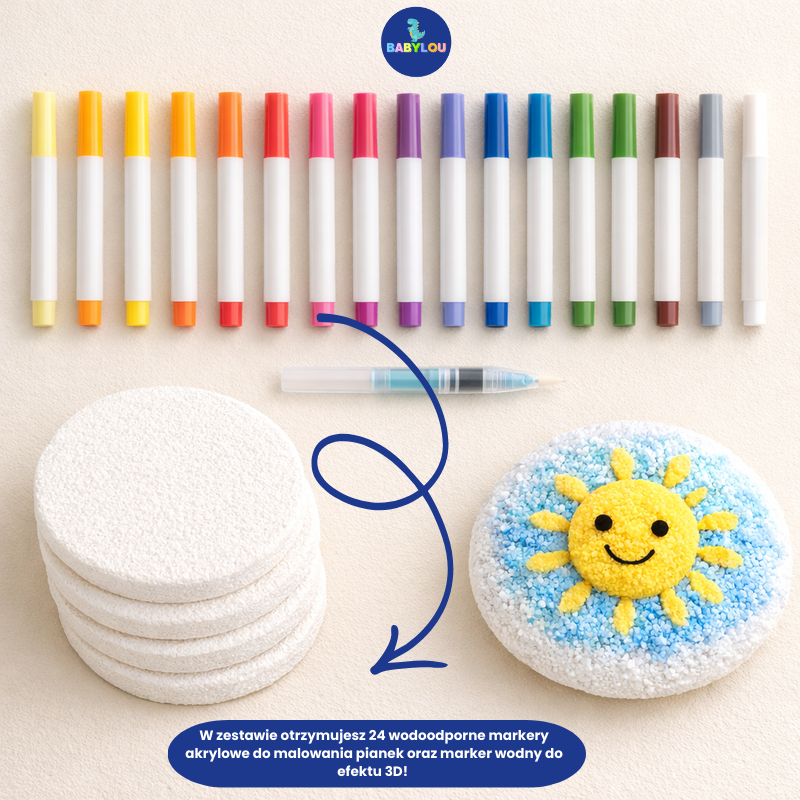 Każdy zestaw zawiera zestaw specjalnych pisaków akrylowych oraz pędzelków wodnych!