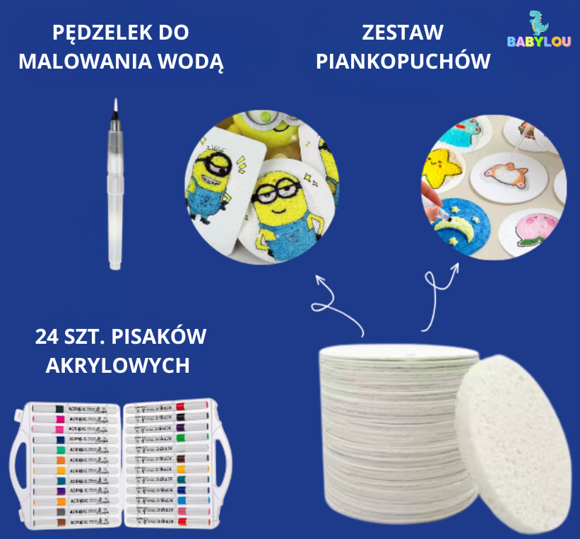 Każdy zestaw zawiera zestaw specjalnych pisaków akrylowych oraz pędzelków wodnych!